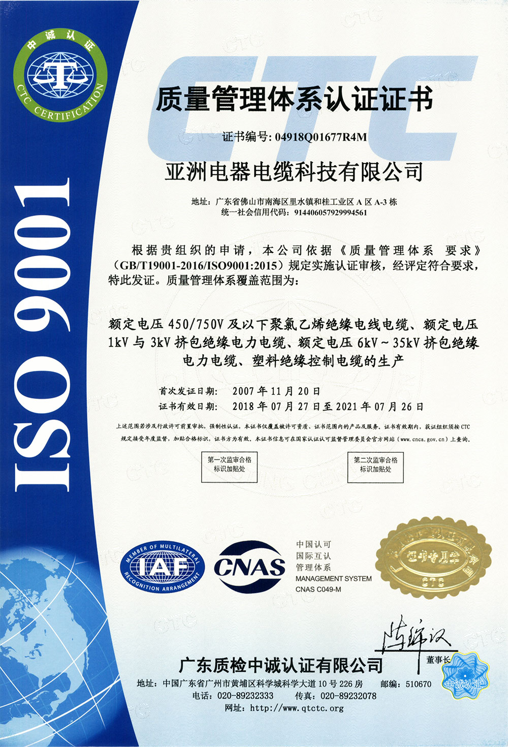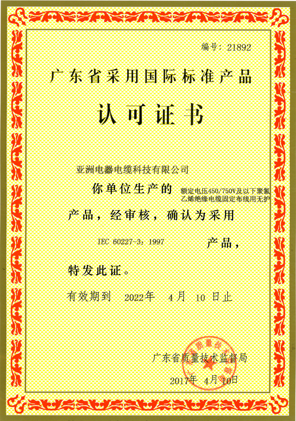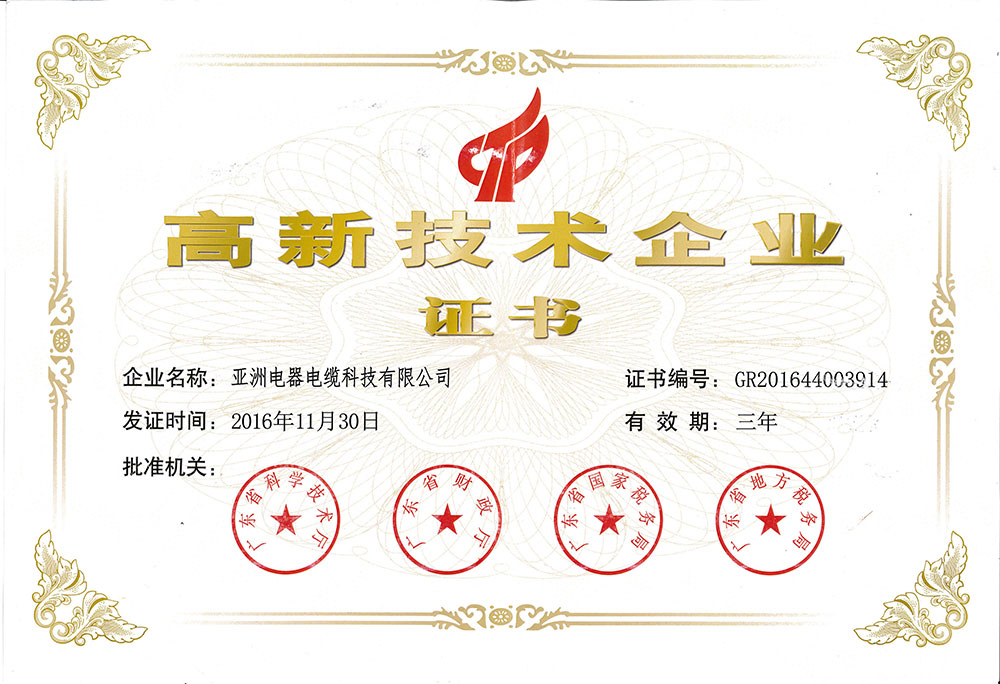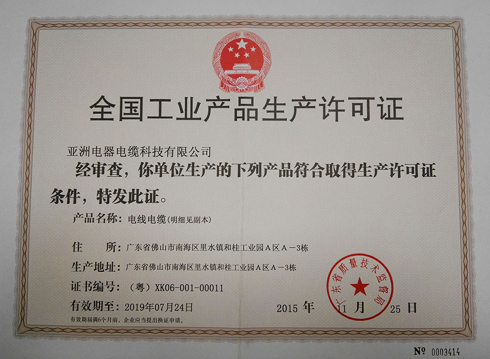 亞洲電器電纜科技有限公司的產品質量,每一條電線電纜都符合國家標準和國際電工委員會標準。企業已通過ISO9001:2008國際標準認證,獲得全國工業產品生產許可證和中國國家強制性產品認證證書(CCC證書),亞洲電纜品牌產品已獲得廣大消費者的一致認可,享譽海內外!