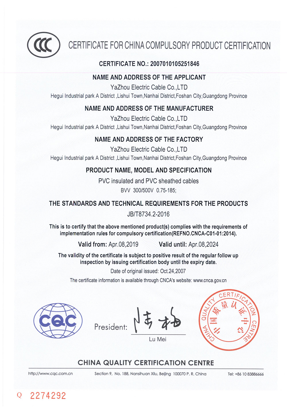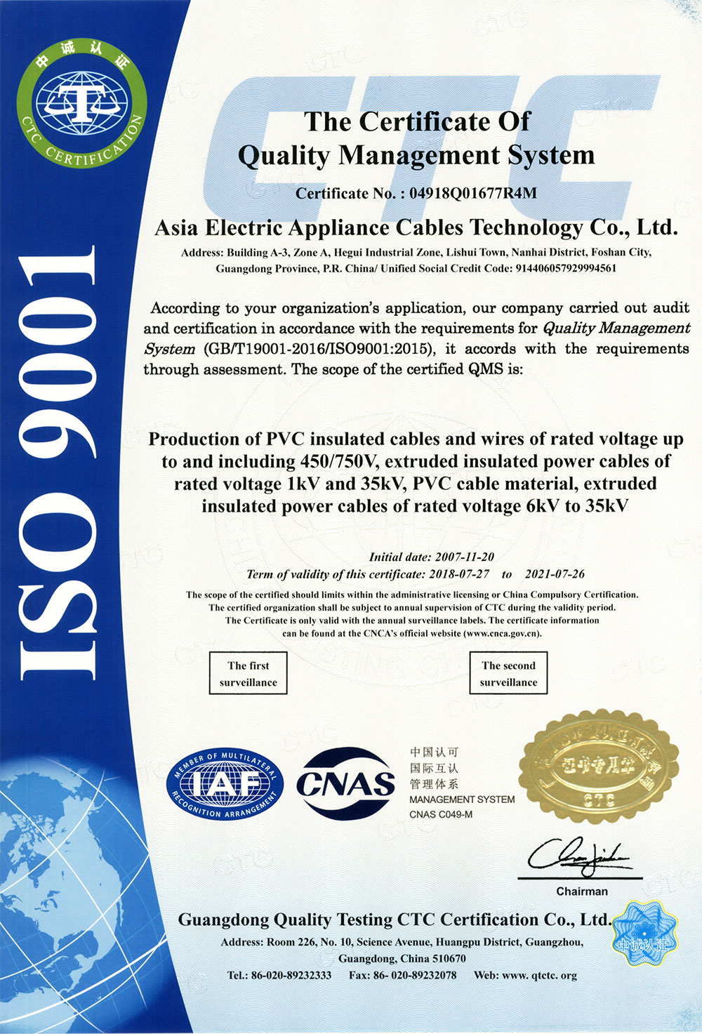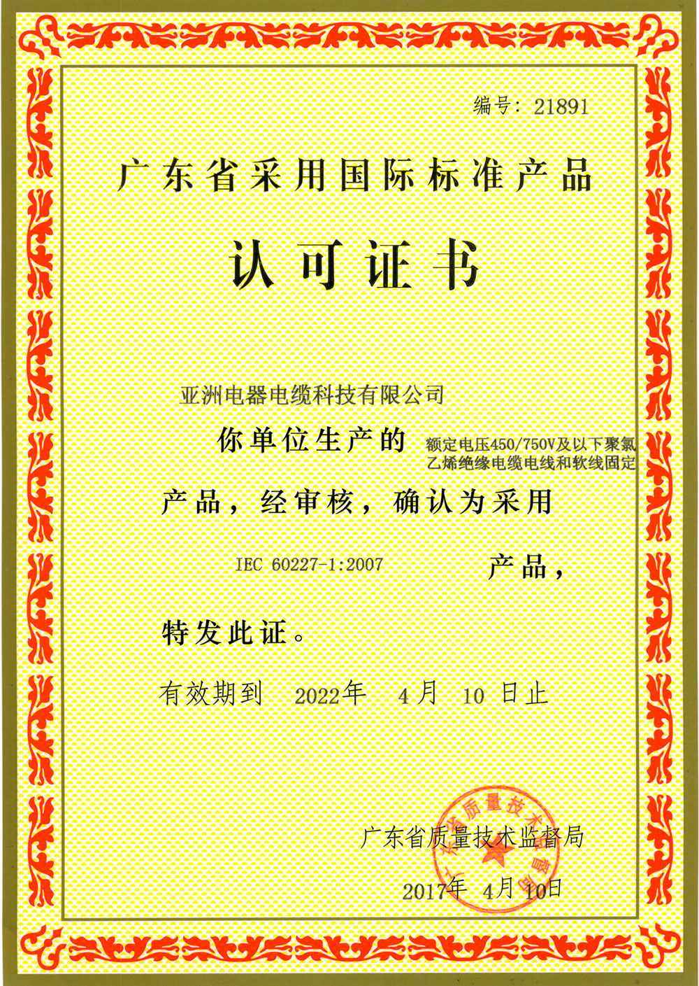 亞洲電器電纜科技有限公司的產品質量,每一條電線電纜都符合國家標準和國際電工委員會標準。企業已通過ISO9001:2008國際標準認證,獲得全國工業產品生產許可證和中國國家強制性產品認證證書(CCC證書),亞洲電纜品牌產品已獲得廣大消費者的一致認可,享譽海內外!