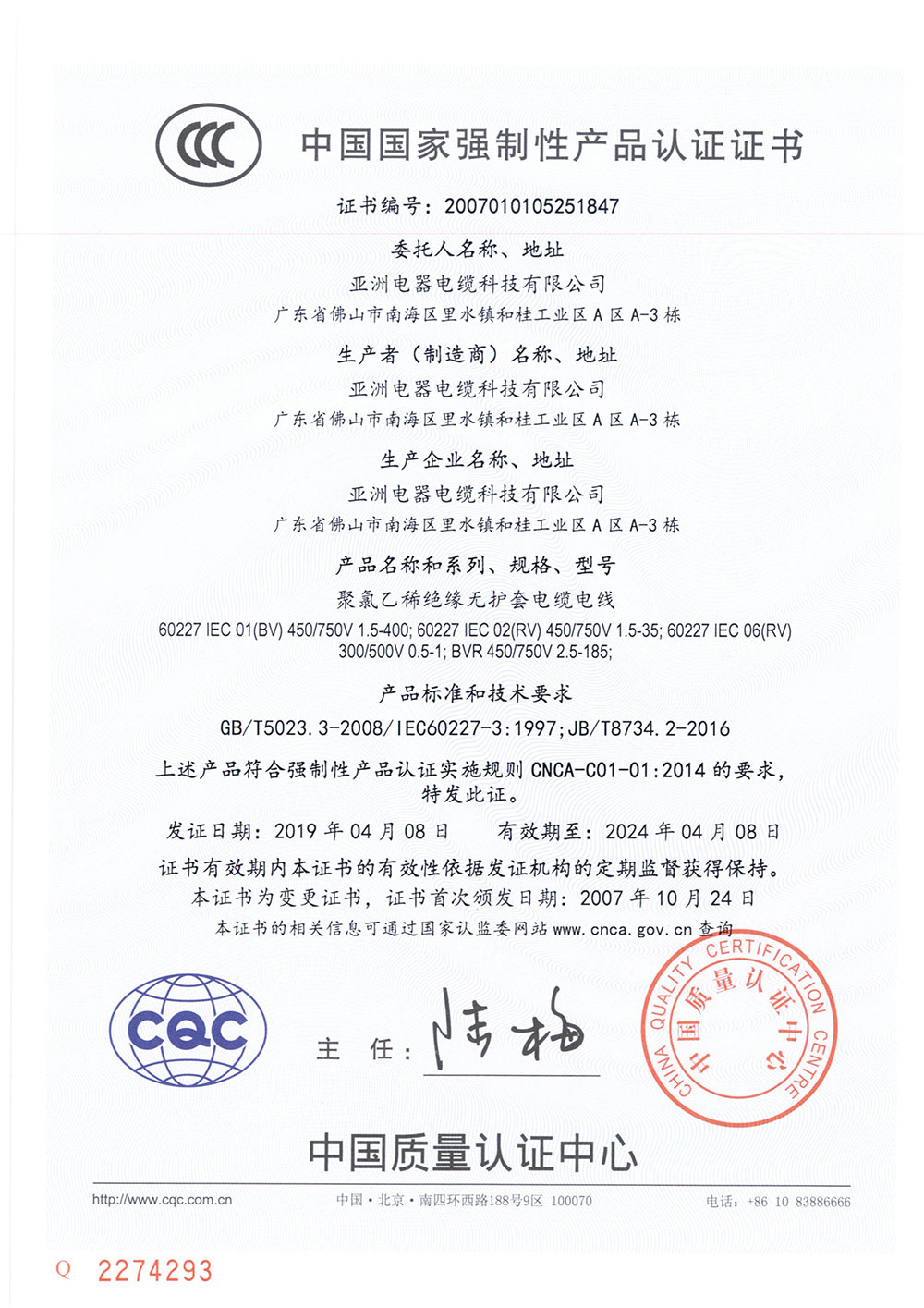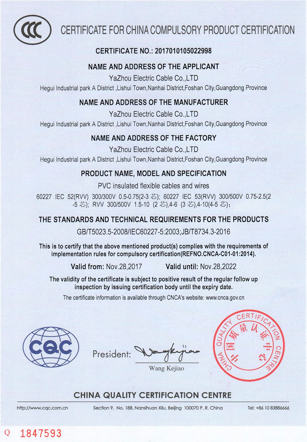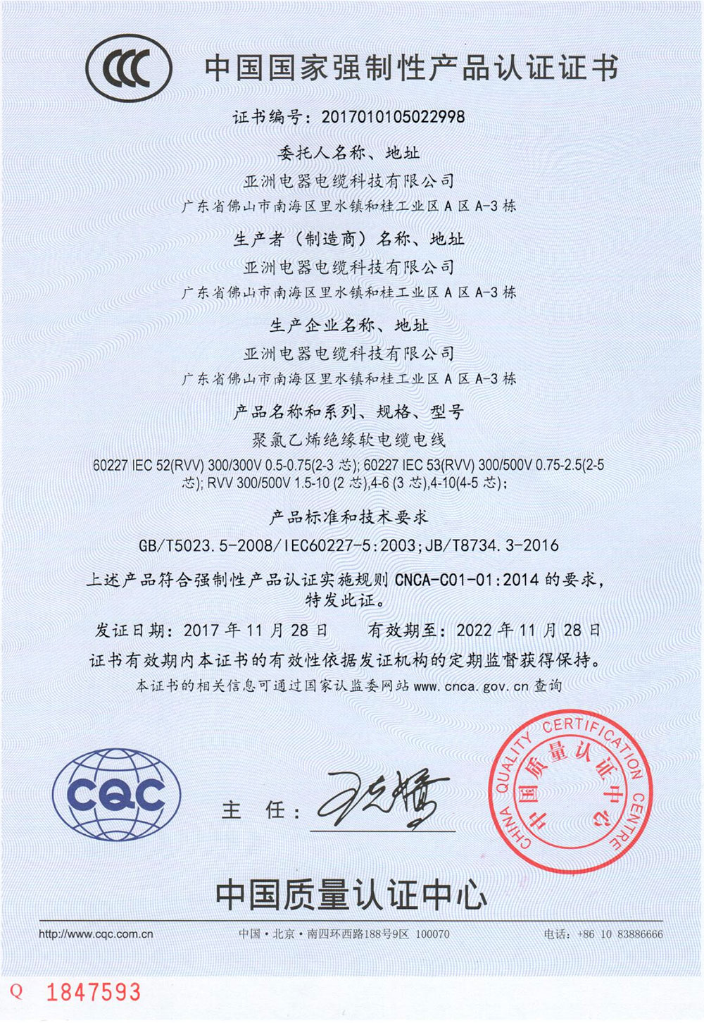亞洲電器電纜科技有限公司的產(chǎn)品質(zhì)量,每一條電線電纜都符合國(guó)家標(biāo)準(zhǔn)和國(guó)際電工委員會(huì)標(biāo)準(zhǔn)。企業(yè)已通過(guò)ISO9001:2008國(guó)際標(biāo)準(zhǔn)認(rèn)證,獲得全國(guó)工業(yè)產(chǎn)品生產(chǎn)許可證和中國(guó)國(guó)家強(qiáng)制性產(chǎn)品認(rèn)證證書(CCC證書),亞洲電纜品牌產(chǎn)品已獲得廣大消費(fèi)者的一致認(rèn)可,享譽(yù)海內(nèi)外!