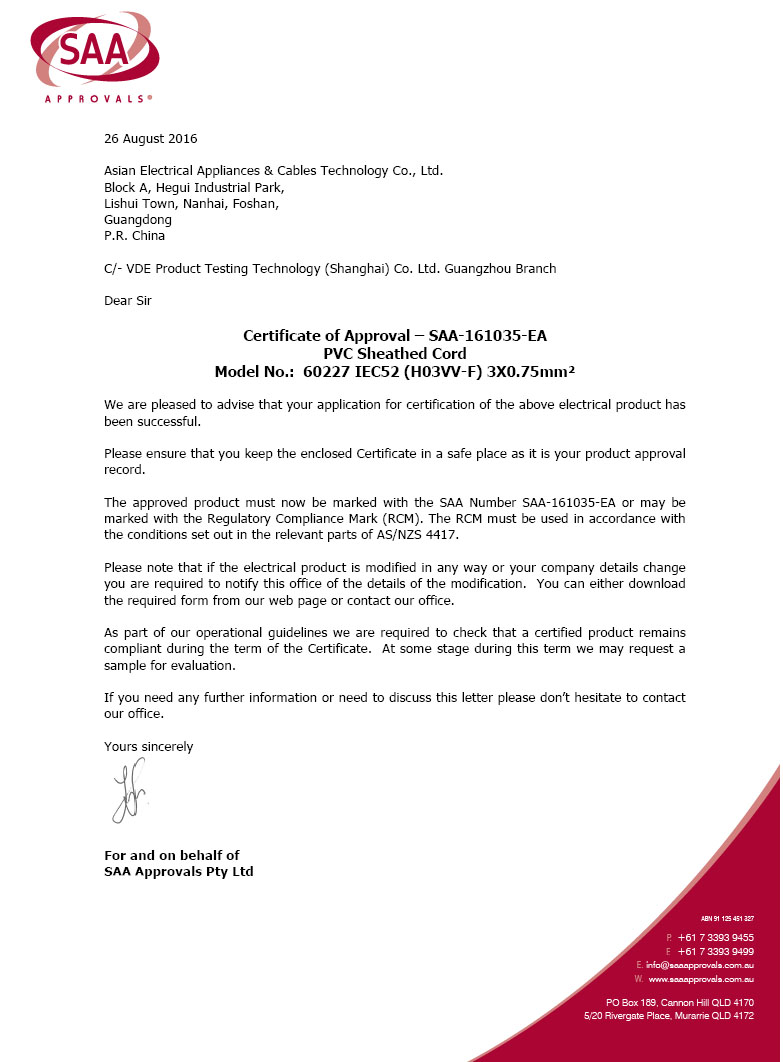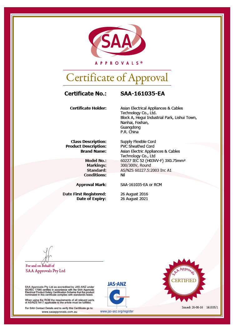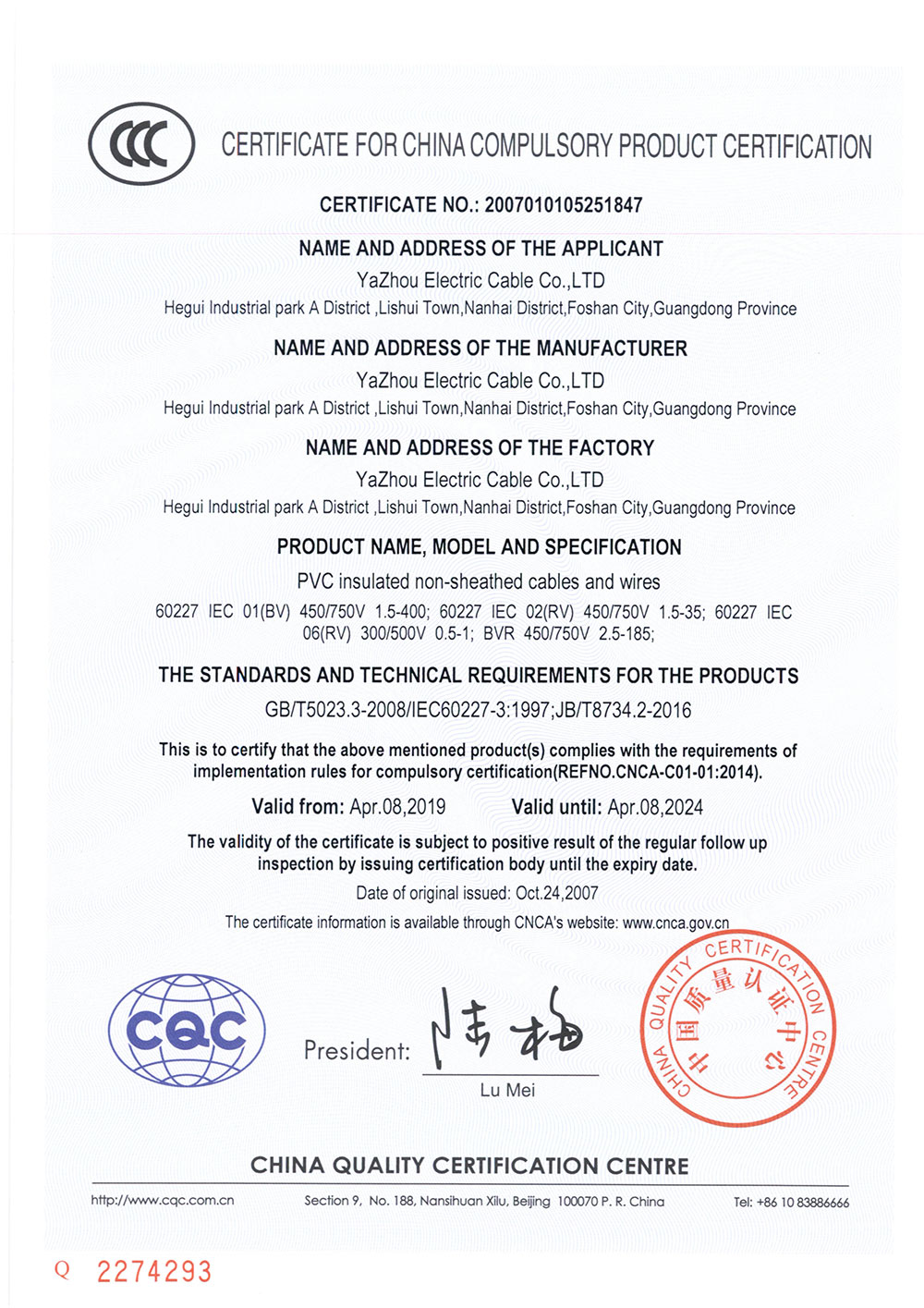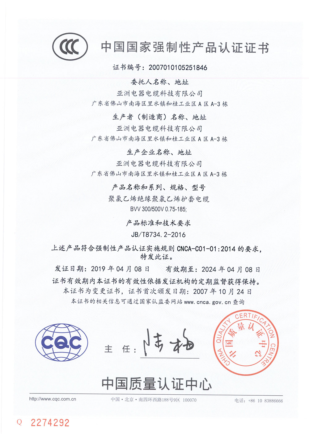亞洲電器電纜科技有限公司的產(chǎn)品質(zhì)量,每一條電線電纜都符合國(guó)家標(biāo)準(zhǔn)和國(guó)際電工委員會(huì)標(biāo)準(zhǔn)。企業(yè)已通過(guò)ISO9001:2008國(guó)際標(biāo)準(zhǔn)認(rèn)證,獲得全國(guó)工業(yè)產(chǎn)品生產(chǎn)許可證和中國(guó)國(guó)家強(qiáng)制性產(chǎn)品認(rèn)證證書(CCC證書),亞洲電纜品牌產(chǎn)品已獲得廣大消費(fèi)者的一致認(rèn)可,享譽(yù)海內(nèi)外!