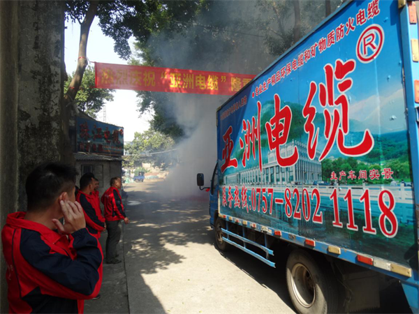 11點(diǎn)18分,鞭炮被點(diǎn)燃,車隊(duì)準(zhǔn)時(shí)出發(fā),鞭炮聲響徹云霄,寓意“亞洲電纜”紅紅火火,暢銷全國,走向世界!